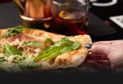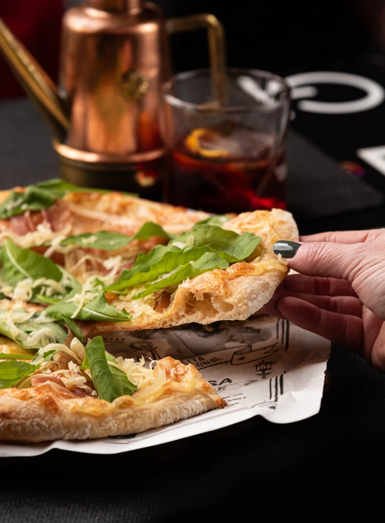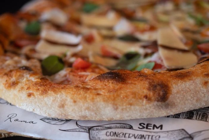 Pinsa Romana com fermentação natural de 48h e mix exclusivo de farinhas (trigo, arroz e soja)